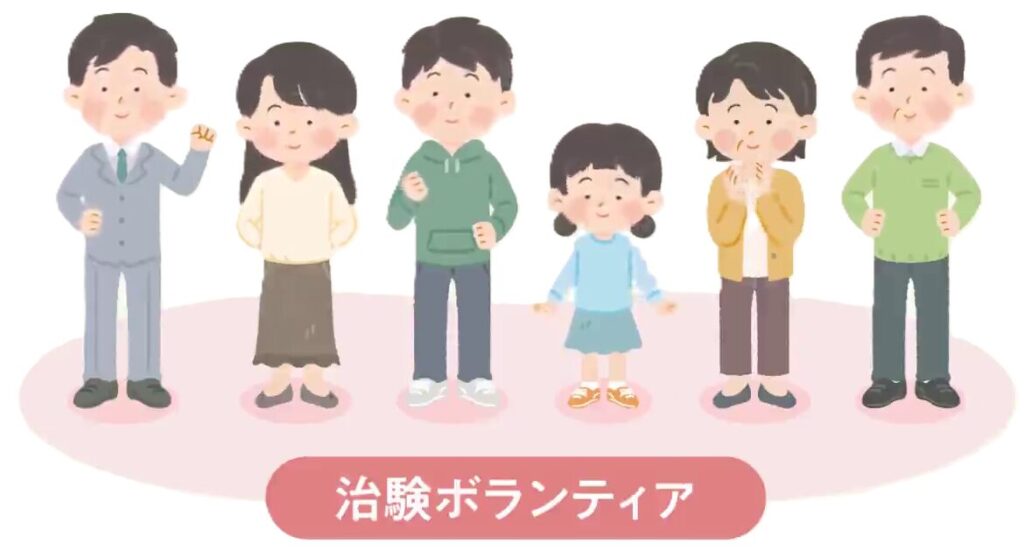 新しい薬の候補は、厚生労働省の承認を得るため「治験ボランティア」と呼ばれる方たちにご協力いただき安全性や有効性を確認するための様々な検査が行われます。